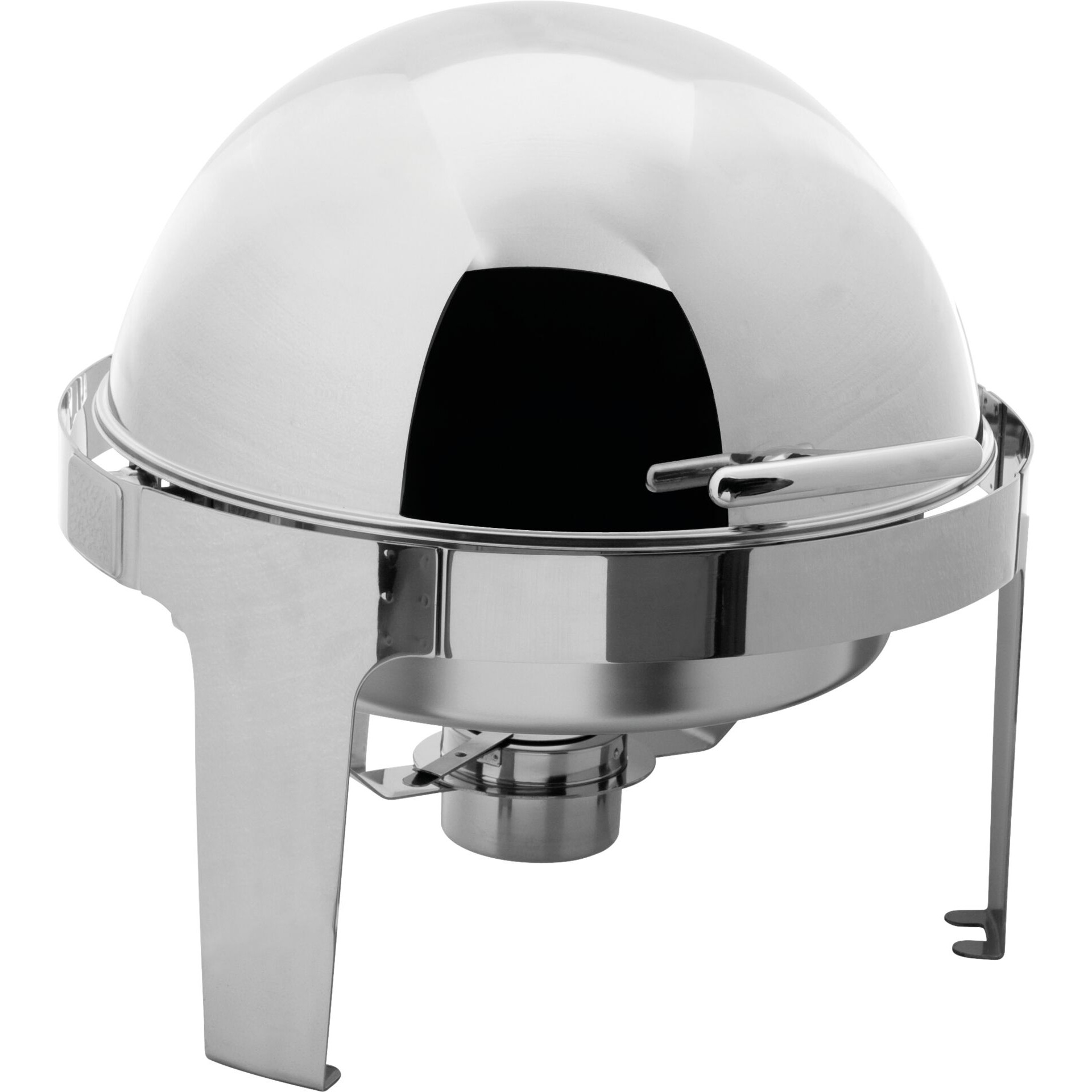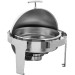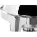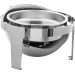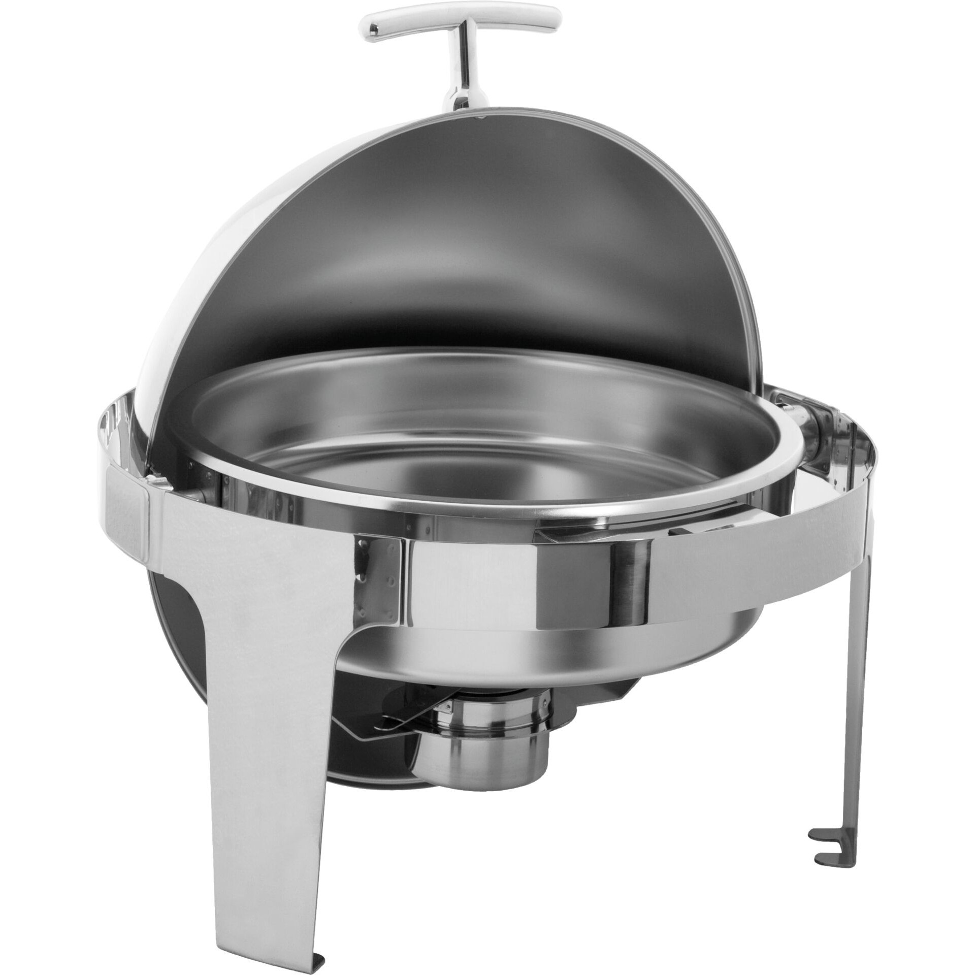 Edelstahl 18/10, poliert, rund mit Rolltopdeckel. Inhalt: 6 Liter. Komplett mit Einsatz 65 mm tief und einem Brennstoffhalter. Schwere Ausführung.
