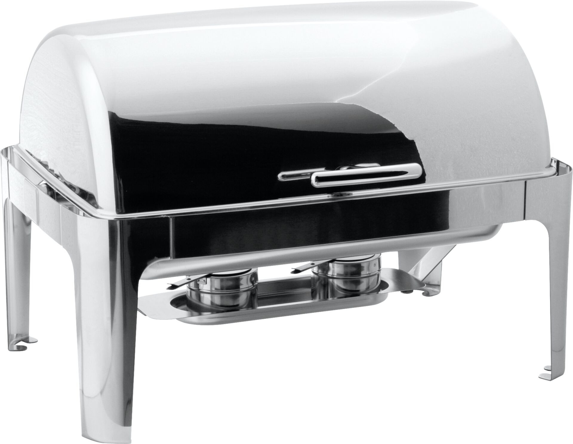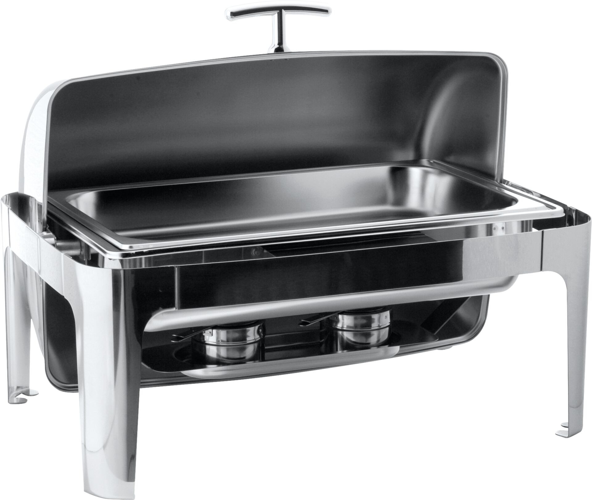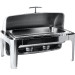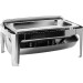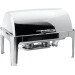Edelstahl 18/10, poliert, rechteckig mit abnehmbaren Rolltopdeckel (kippbar). Komplett mit 1/1-GN-Einsatz 65 mm tief und 2 Brennstoffhaltern. Schwere Ausführung.