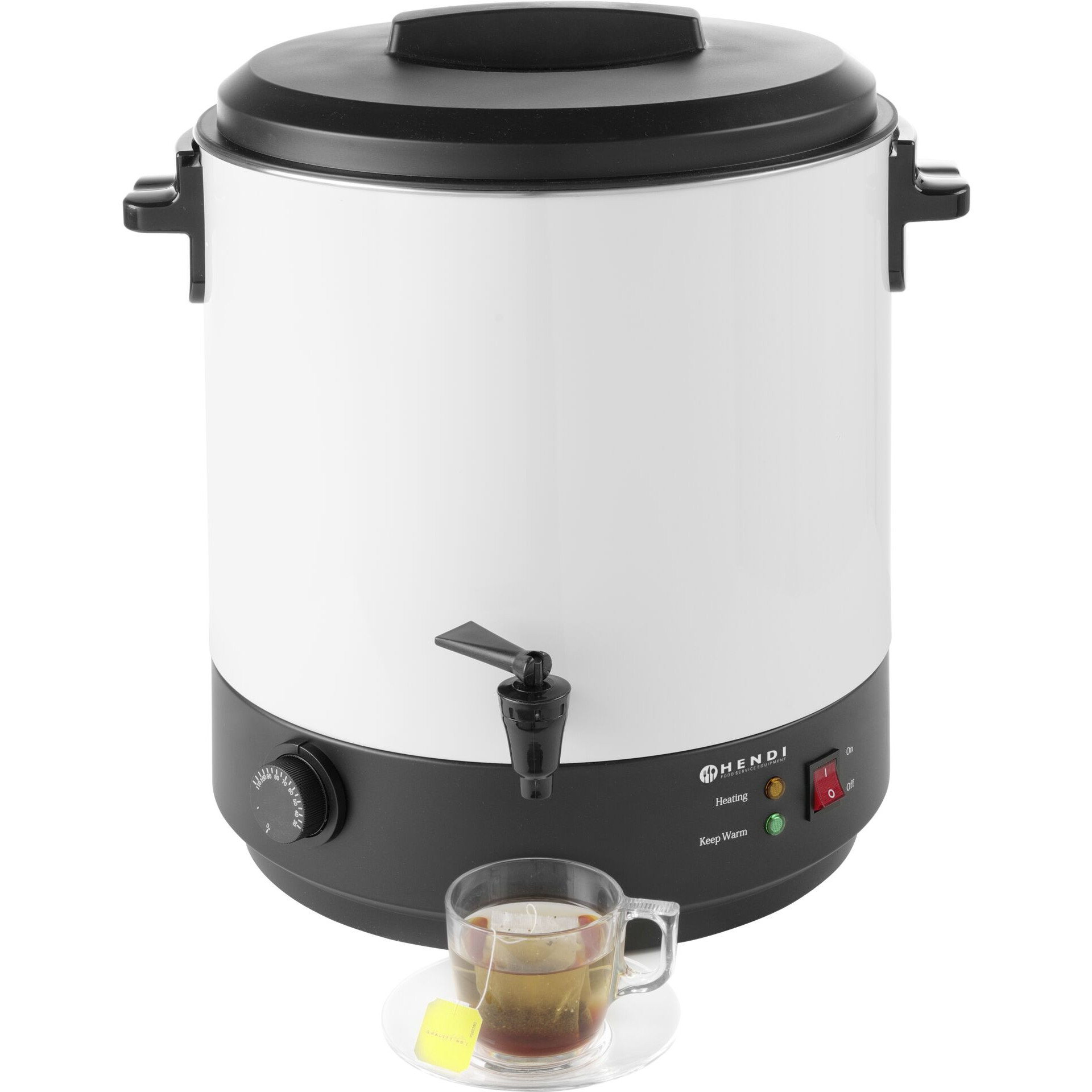 Kessel aus beschichtetem Edelstahl. Wärmeisolierte Griffe aus Polypropylen und Anti-Tropf-Ablasshahn. Thermostat einstellbar bis 110°C. Ideal für Glühwein und heißes Wasser. Aufheizdauer ± 75 min. Nicht geeignet für heiße Schokolade oder Milch. 25 Liter Nutzinhalt, 230 V, 2500 W, LxBxH in cm: 44,7x44,1x48,5 cm.