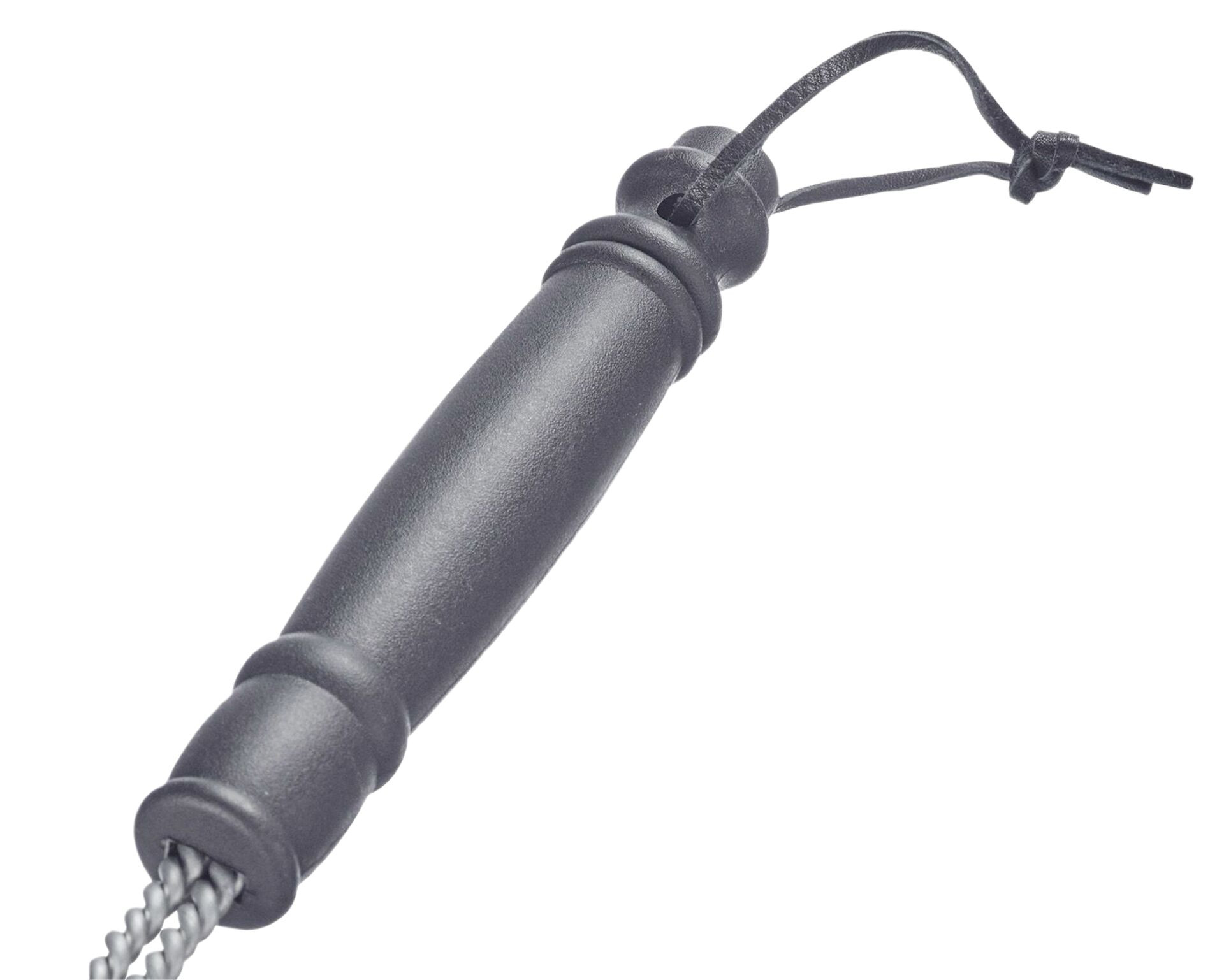 Grillbürste aus Edelstahl zur gründlichen Reinigung von Holzkohle-, Gas- und Elektrogrillgeräten. Nicht spülmaschinengeeignet. Mit Lederschlaufe zum Aufhängen. Maße: LxB 46x15cm (Bürstenbreite).
