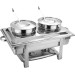 Edelstahl 18/10, poliert, komplett mit Wasserbad und 2 Suppeneinsätzen (je 4 Liter), mit 2 Deckel (mit Löffelausschnitt), 2 Schöpflöffeln und 2 Brennstoffhaltern. 2 Schnäbel am Rahmen können als Deckelhalter genutzt werden.