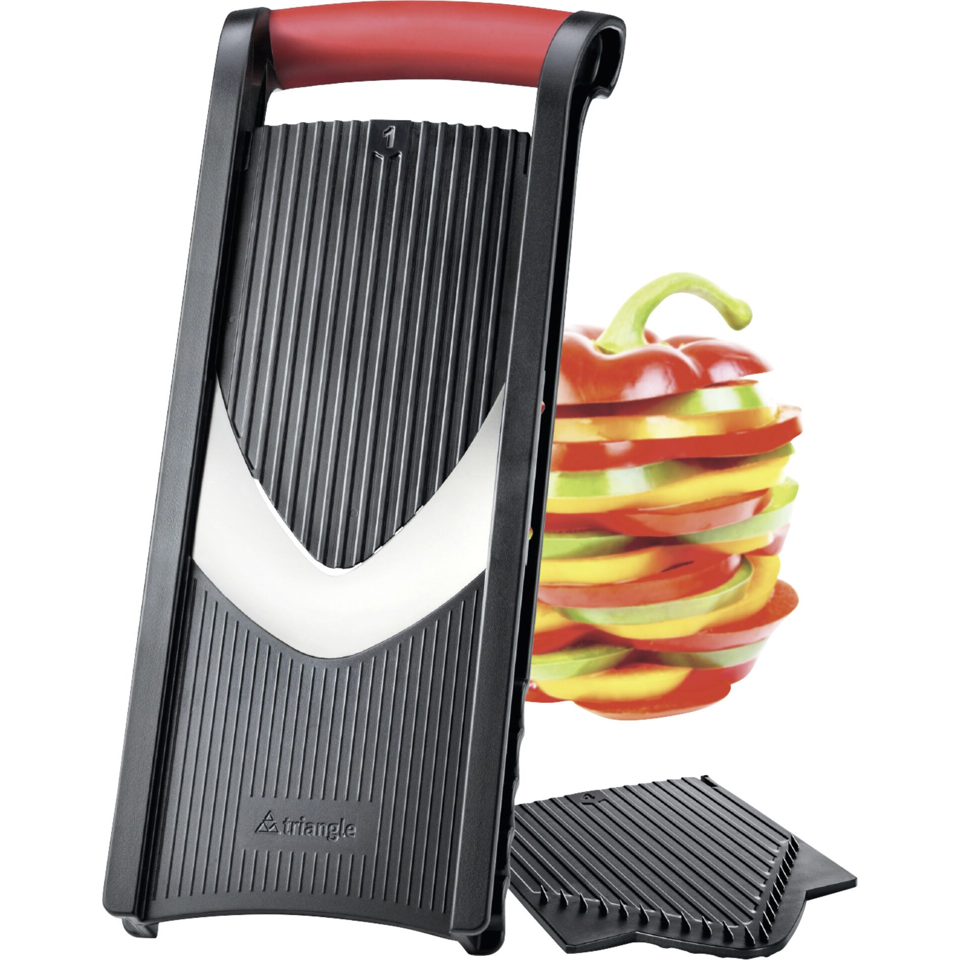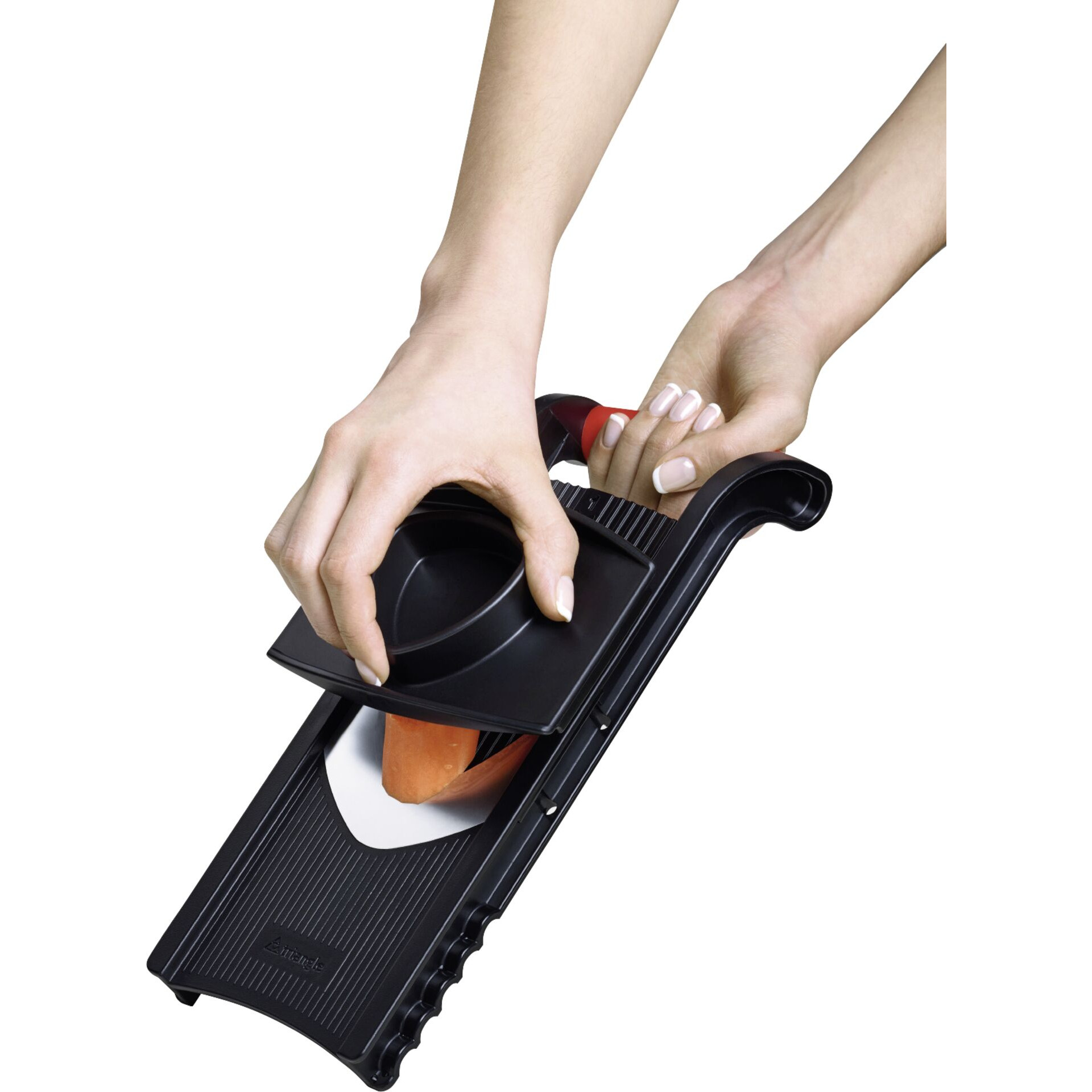 Edelstahlmesser und Kunststoffgehäuse. 2 wendbare Einsätze für 3 verschiedene Dicken & Julienne. Klingenschutz. Restehalter. Spülmaschinengeeignet.