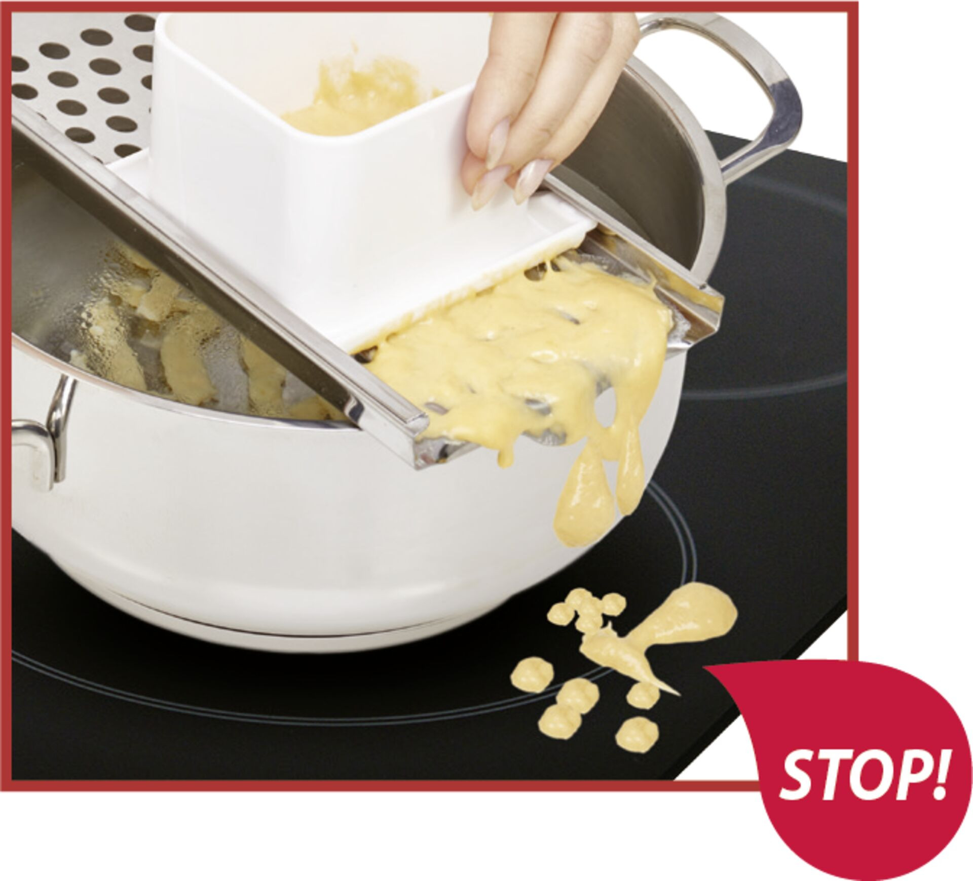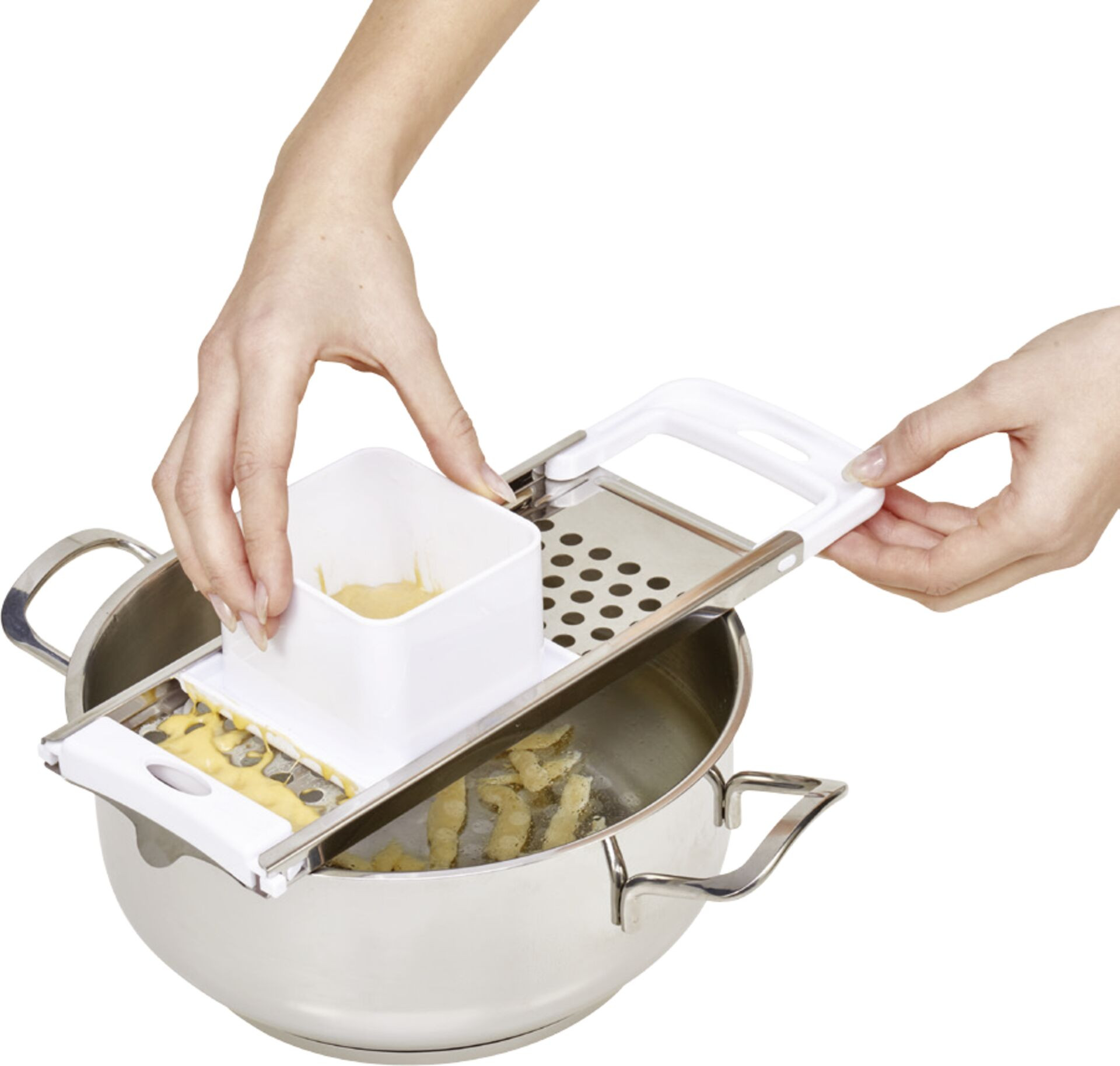 Edelstahl, für die Zubereitung von kurzen Spätzle (Knöpfle), verbesserte, tropffreie Ausführung, stabiler Rahmen mit Griff aus Kunststoff, spülmaschinengeeignet.