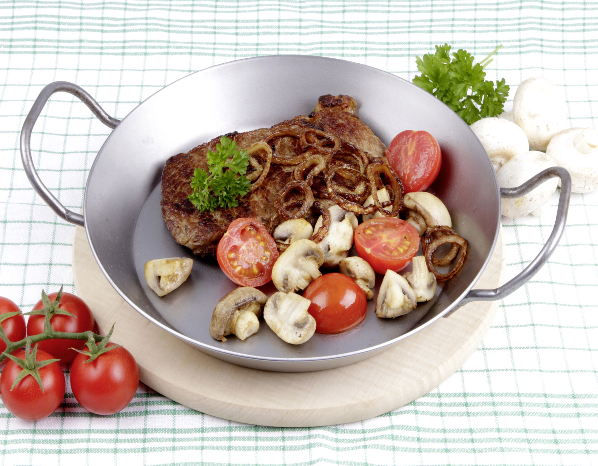 Mit 2 Griffen. Aus Eisen, 2 mm stark. Für alle Herdarten, Backofen, Gas-/ Holzkohlegrill und offenes Feuer geeignet. Nicht spülmaschinengeeignet.